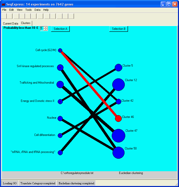 This tools is designed to give an indication as to the biological behaviour of the clusters found by SeqExpress. Some behaviours are relatively simple to ascertain by simple geometry (for example cyclic behaviours), however most genes have a complex involvement in the governing of cellular machinery and so further analysis is needed.